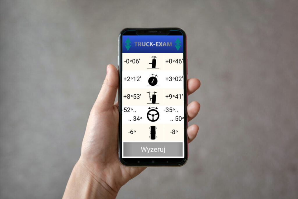 TRUCK-EXAM™ kann mit Wi-Fi-Kommunikation ausgestattet werden. Es ermöglicht die Messung der meisten Parameter (RADNEIGUNG, RÜCKWÄRTS-ACHSEN-TIEFE, RÜCKWÄRTS-ACHSEN-TIEFE, MAXIMALE RADDREHUNG, RADDREHUNGS-DIFFERENZ) in einer einzigen Messung. Ein weiterer Vorteil ist die sofortige und direkte Übertragung der Ergebnisse auf eine App auf einem Smartphone oder Computer.