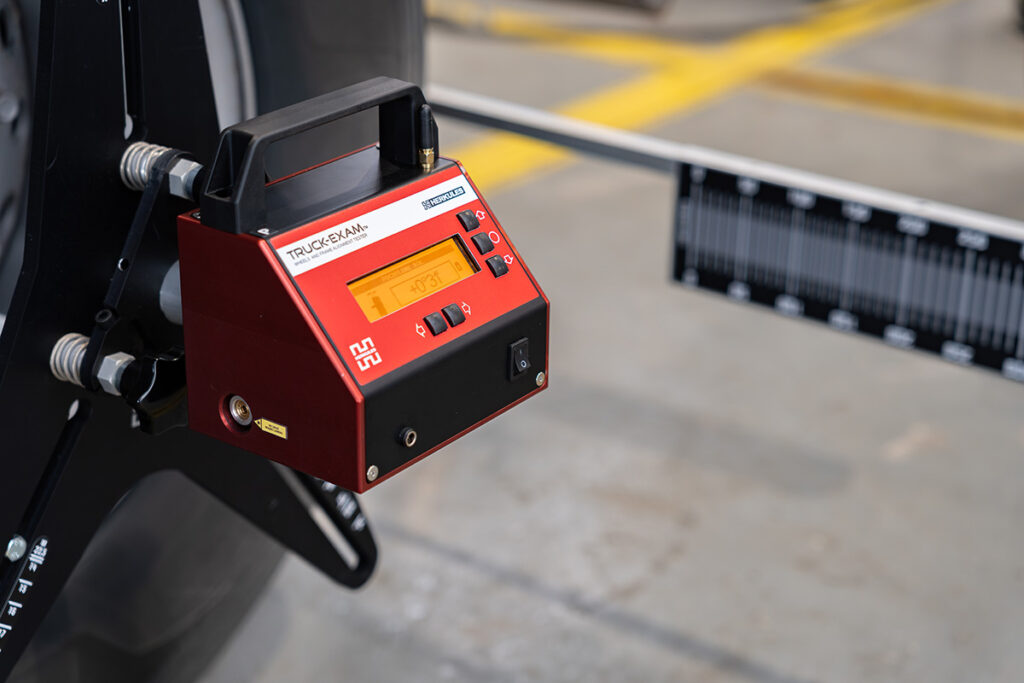 TRUCK-EXAM™ ist ein Elektronik-Laser-Gerät zur Messung der Fahrwerksgeometrie von Nutzfahrzeugen. Vertikale Winkel werden elektronisch gemessen und das Messsignal wird von Miniatur-High-End-Neigungsmessern gewonnen. Die Messköpfe der neuesten Version sind außerdem mit Miniatur-Gyroskopen zur Messung der Radlenkung ausgestattet. Horizontale Winkel werden mit einer optischen Methode mit Halbleiterlasern gemessen.
